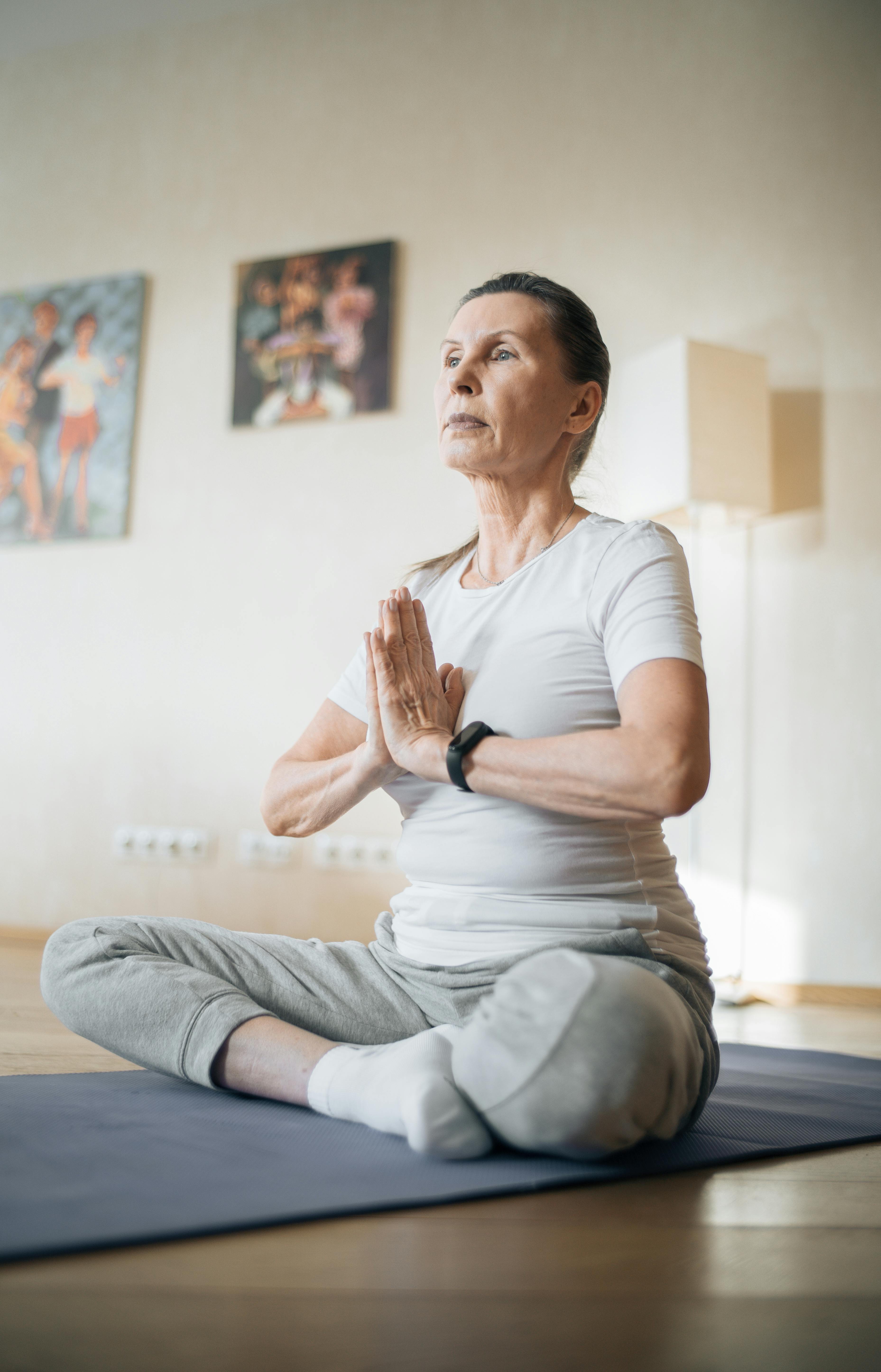 An elderly woman yoga mat exercise